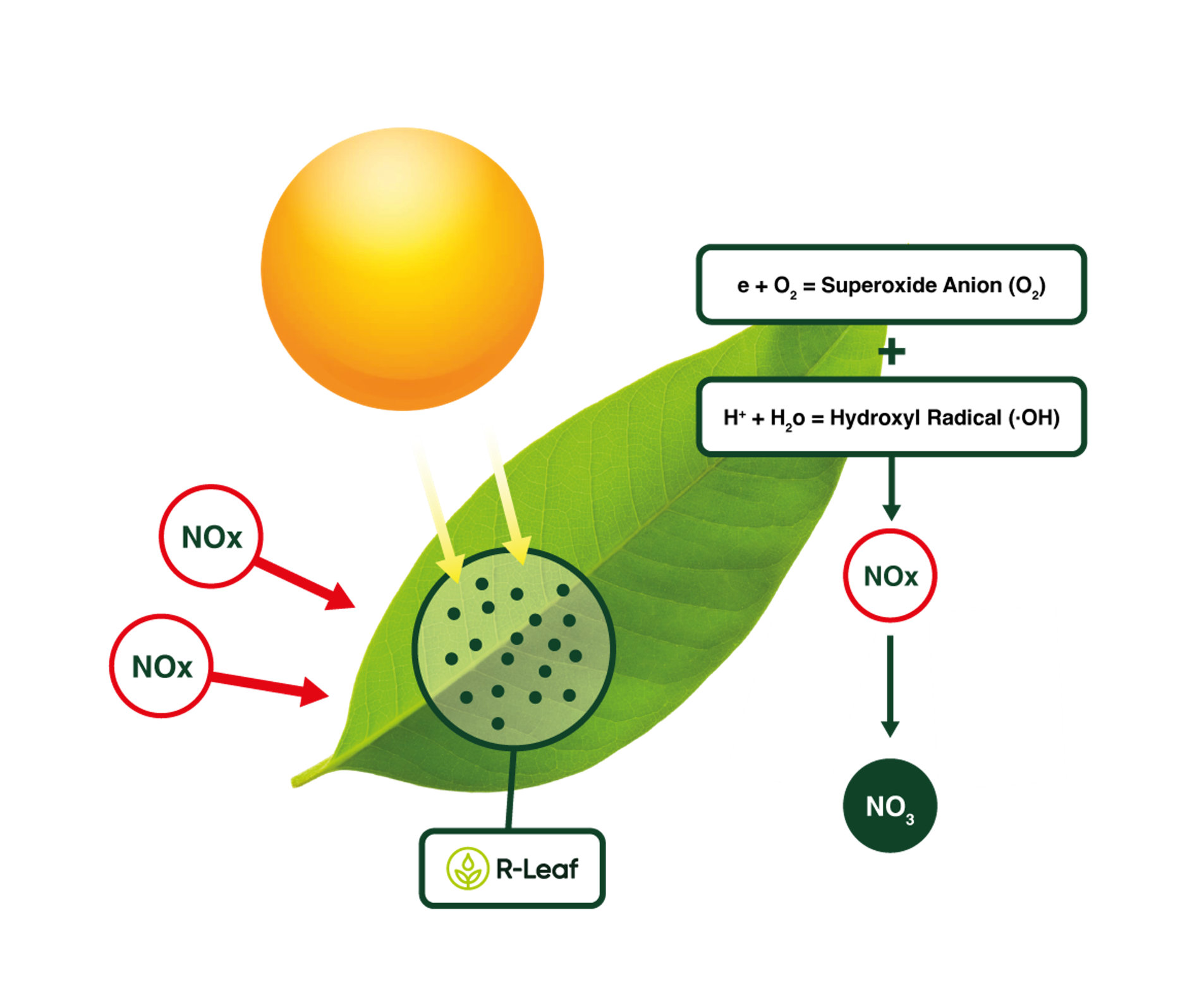 “Known as R-Leaf, the photocatalyst is a specially processed titanium dioxide that uses daylight to capture and convert nitrogen oxides (NOx), known air pollutants, directly into crop-usable nitrates. These small but continuous doses of nitrate add up to an average of 50kg N/ha during the growing season.